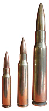 目前北約的狙擊槍彈。左邊是7.62毫米,中間是.338 Lapua,右邊是.50口徑BMG。