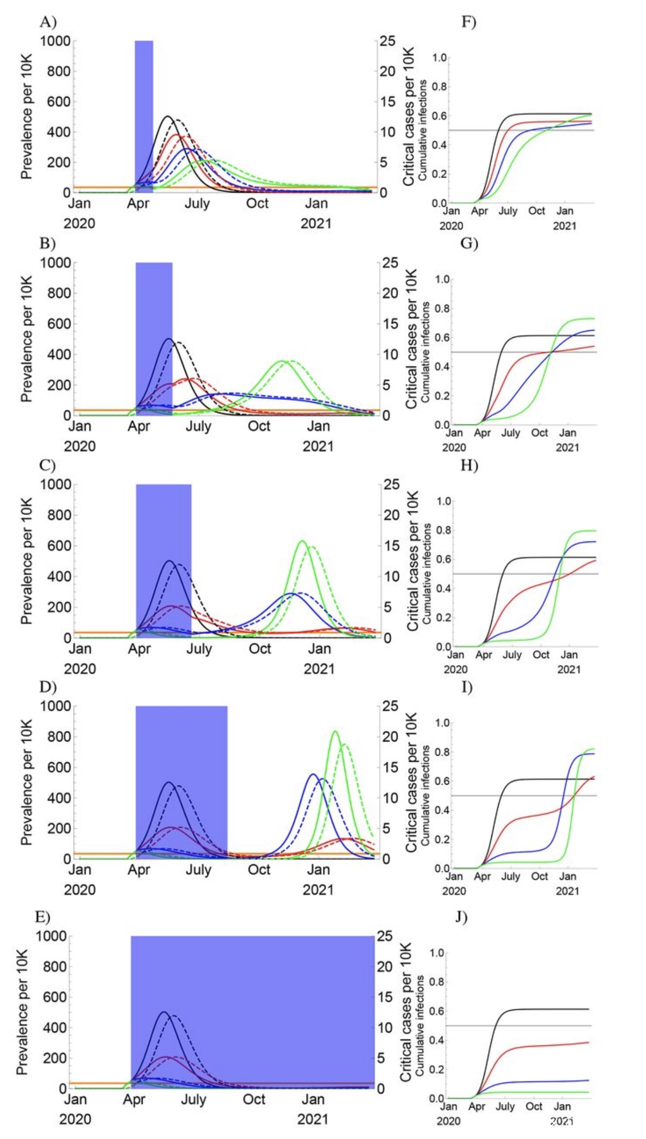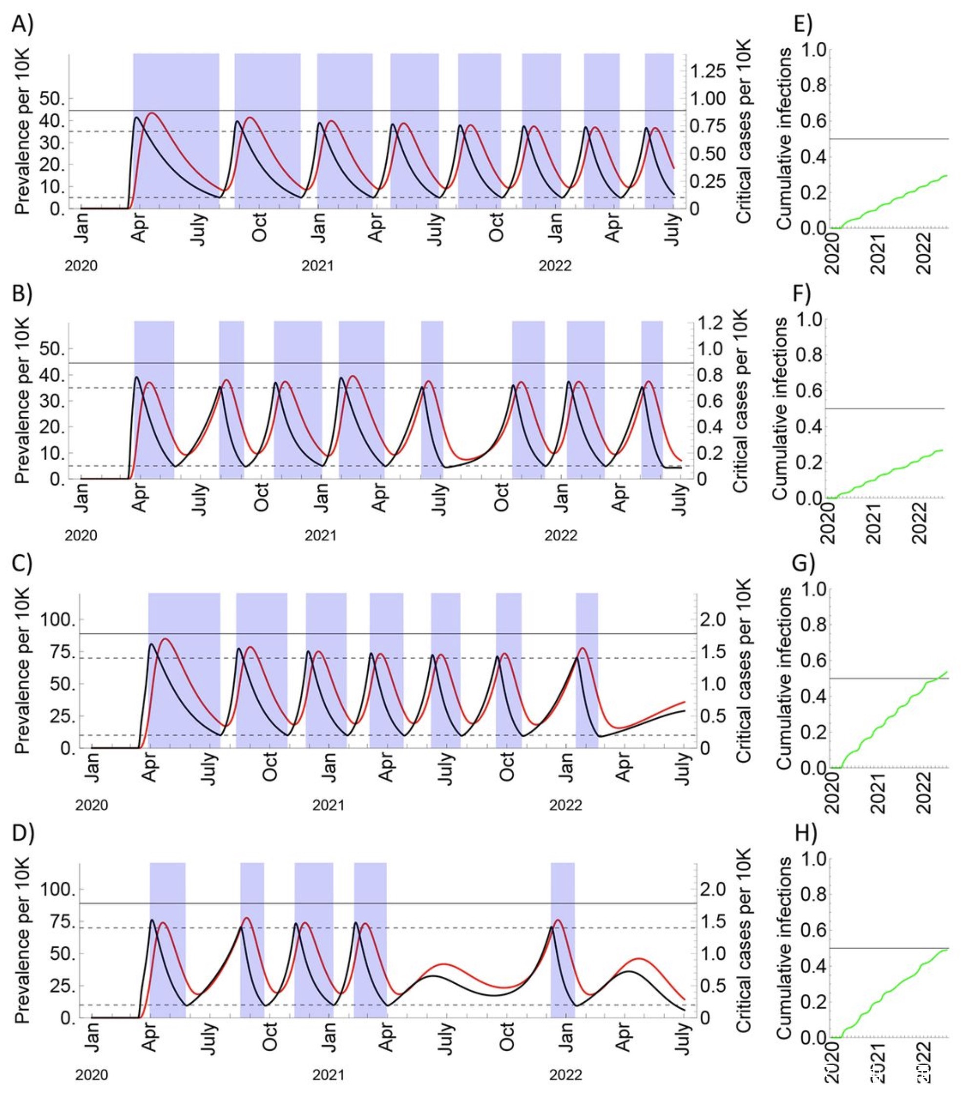 研究者還評估了間歇性社交疏遠措施,其目的是在感染流行率高於閾值時將社交疏遠功能設置為“開”,而當感染率低於第二個較低閾值時將社交隔離功能設置為“關閉”,以保持重症監護的數量每10000名成人中0.89以下的患者。研究者設置每10000人中有35例病例達到“開”,設置每10000名成年人中有5例作為“關閉”閾值。