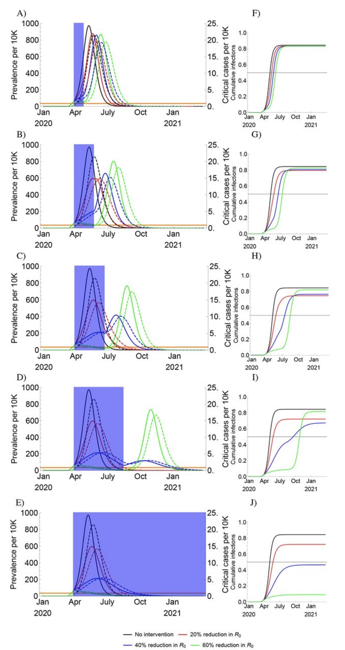 對於具有季節性變化的模擬,無論是在高峯流行率方面還是在感染總數方面,干預後的二次暴發高峯都可能超過此前不干預的流行病的規模。強烈的社交疏遠措施讓人口中的易感人羣的維持高比例,當R0在深秋和冬季上升時就會導致強大的流行病。沒有一項一次性干預措施能夠有效地將重症患者的患病率保持在重症監護能力以下。