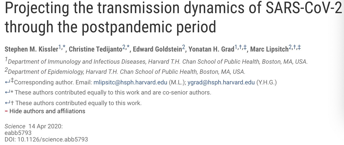 該研究於當地時間4月14日刊登於頂尖學術期刊《科學》(Science)雜誌,通訊作者為哈佛大學流行病學教授Marc Lipsitch與哈佛大學免疫與傳染病學教授Yonatan H. Grad。