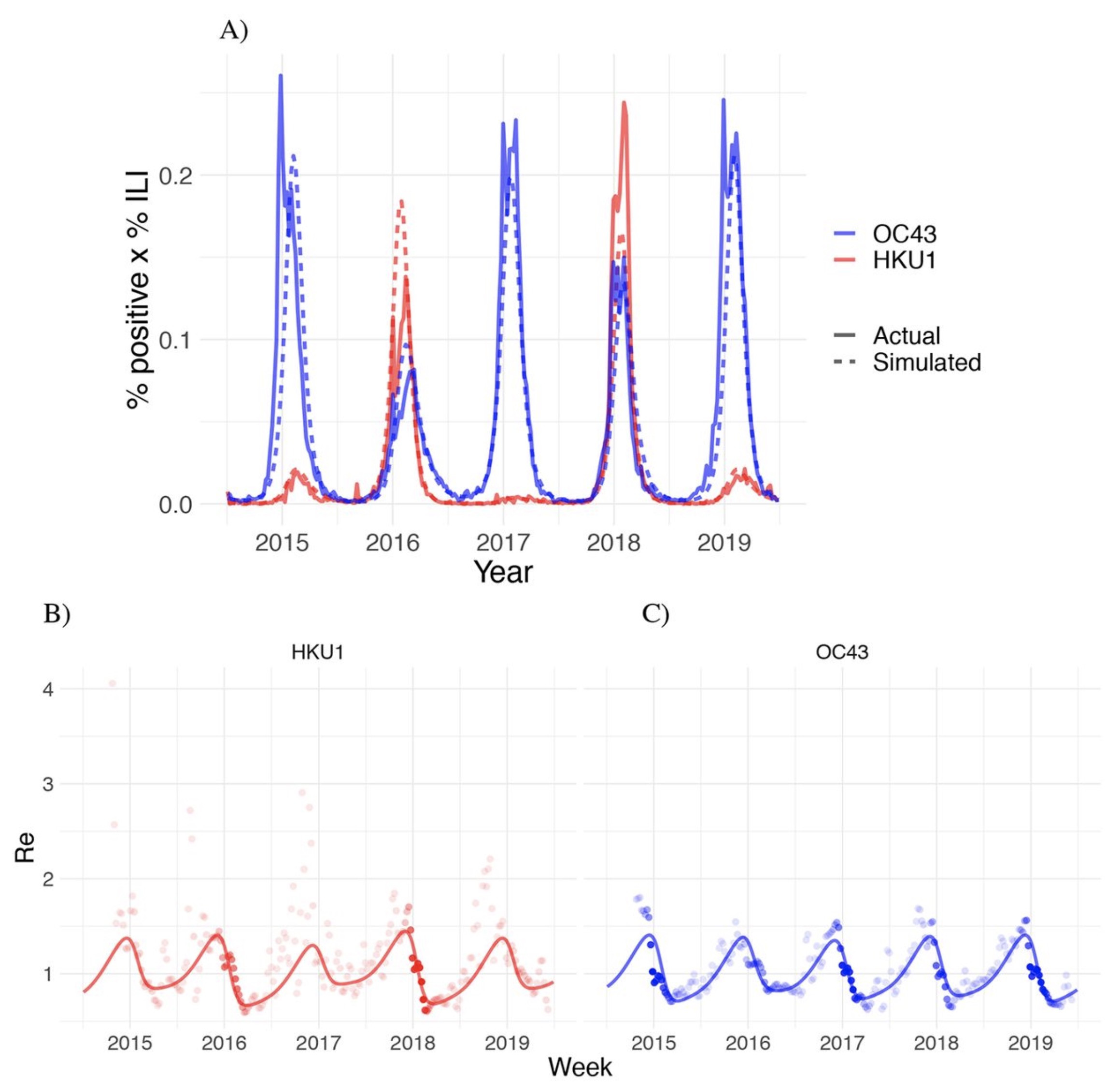 根據最佳擬合模型參數,HCoV-OC43和HCoV-HKU1的R0在夏季的1.7和冬季的2.2之間之間變化。R0的峯值出現在1月第二週。與根據數據估算的季節性一致。