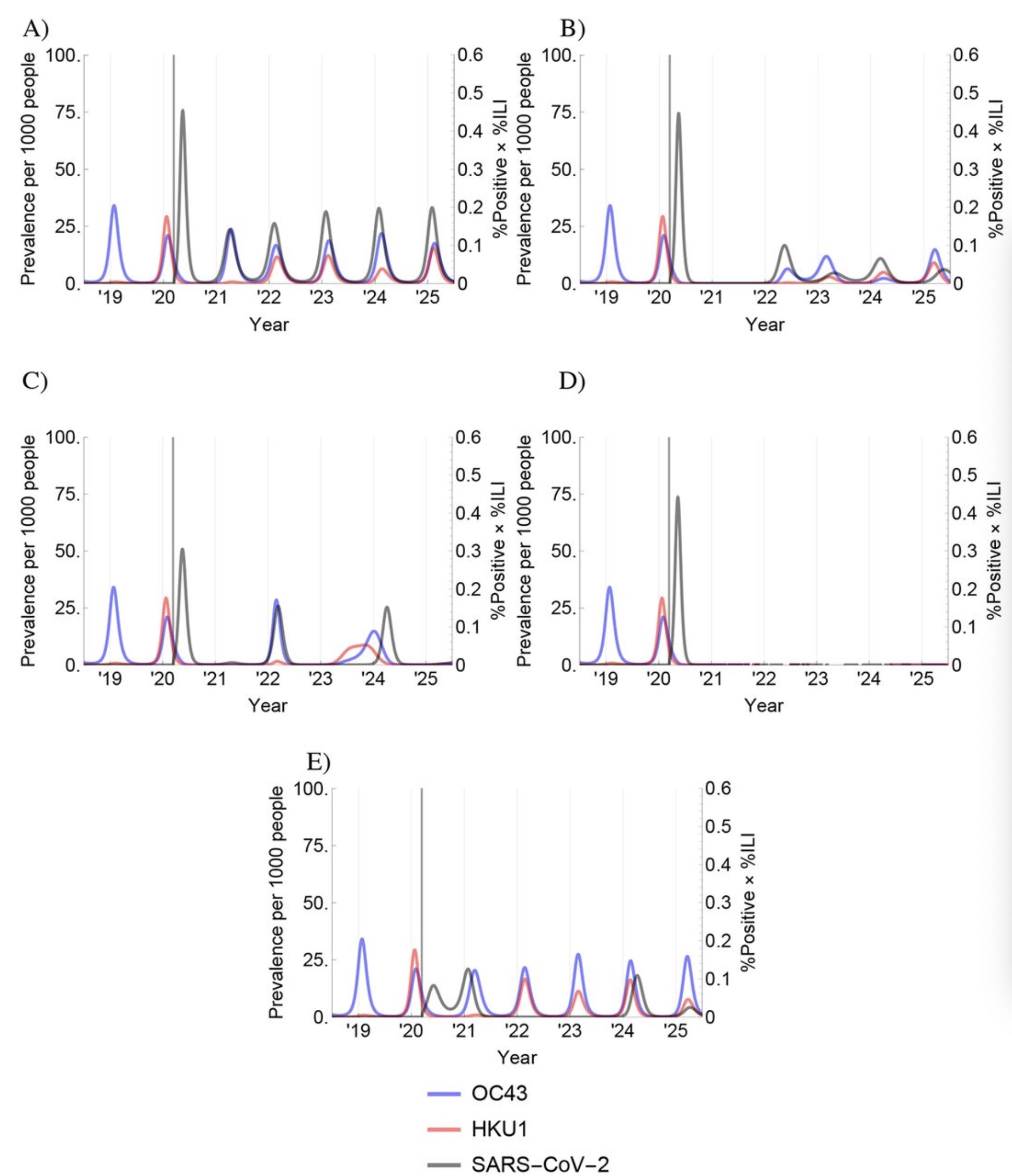 正如預期的那樣,每種毒株的易感性枯竭與該毒株的傳播能力呈負相關。每個毒株的易感性消耗也與其他β冠狀病毒株的感染數呈負相關,這些提供了交叉免疫的證據。另外,HCoV-HKU1的交叉免疫與自我免疫效果之比大於HCoV-OC43,這表明HCoV-OC43具有更強的交叉免疫性。每種毒株的季節係數在各個季節中都相當一致,並且與先前季節的發病率之間沒有明顯的相關性,這與這些β冠狀病毒株一年之內免疫力大幅下降的實驗結果也是一致的。