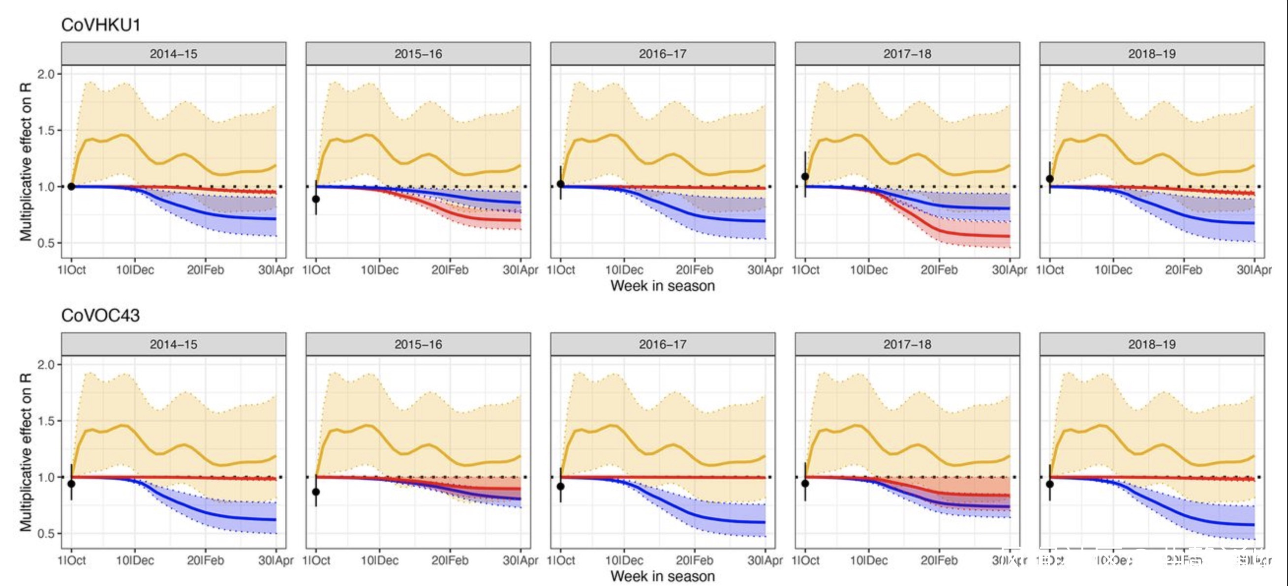 為了量化免疫和季節對β屬冠狀病毒傳播動態的影響,研究者採用了迴歸模型,該模型將每種毒株(HKU1和OC43)的有效感染數表示為基線可傳播常數(該數字與基本傳染數R0和每個季節開始時易感人羣的比例有關),並涵蓋了同一毒株感染導致的易感性枯竭、另一毒株感染而導致的易感性枯竭以及無法解釋的季節性傳播強度變化等。這些協變量能夠解釋大多數觀察到的有效感染數的變異性(調整後的R2:74.3%)。這些協變量中每個變量對每週感染數量的估計乘積效應如下所示。
