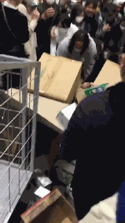 據視頻顯示,當工作人員將幾箱口罩拆箱之後,民眾就迫不及待地衝上前去,爭先恐後地搶購口罩,甚至出現推擠、整個前胸都抱滿口罩。