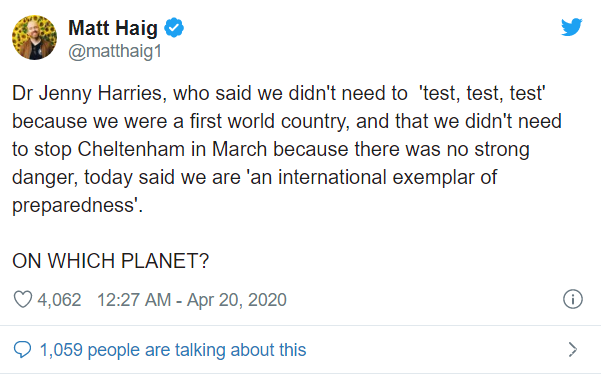 英國著名作家、新聞人馬特·海格翻起了“舊賬”:“哈里斯博士,當初是誰説我們是發達國家、可以不需要做大量檢測?是誰在3月説危險不大,切爾滕納姆市不必封城?又是誰説英國是‘世界典範’?”