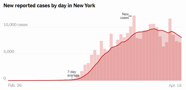 紐約每日確診人數增長圖,曲線開始下降。/NYT