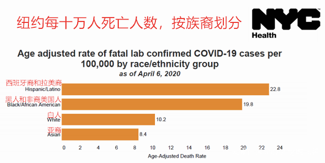 每10萬人中的死亡人數,西班牙裔和拉美裔為22.8人,黑人和非裔為19.8人,而白人是10.2人。