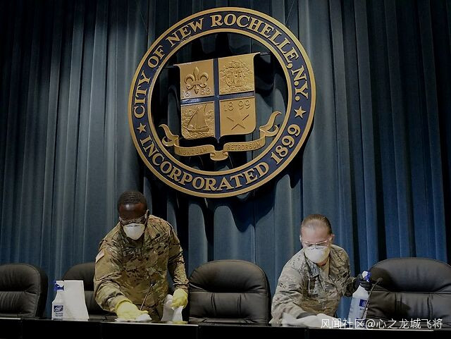 紐約州新羅謝爾,國民警衞隊正在市政廳裏消毒。/ The National Guard