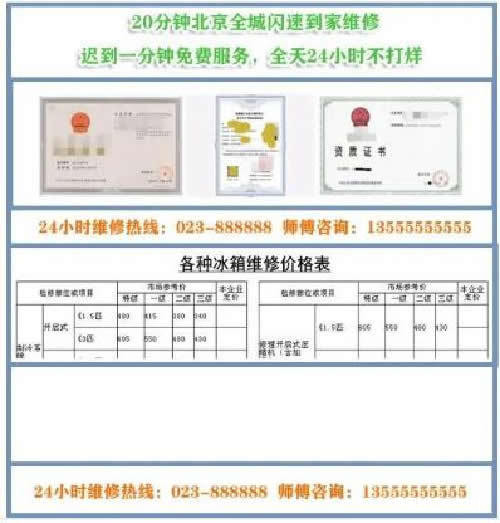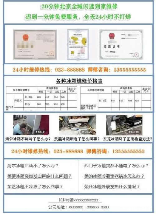 B“維修價錢要實惠”怎麼解決?這也是多數用户關心的問題,都想第一時間知道維修價錢是多少?避免被高價宰割,同時能優惠一點當然最好。我們可以這樣解決,製作一張價目表,根據冰箱型號、維修地點、維修項目來明碼標價,當然得寫出有競爭力的價錢。最後以文字或表格或圖片的形式,放在網站的首頁中上位置即可,讓用户一目瞭然。首頁操作如下參考: