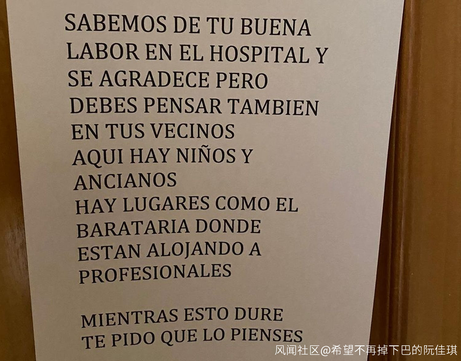 目前擔任住院醫生的28歲赫蘇斯更是在工作12小時下班回家後,發現鄰居們在他的門上留下了一張紙條,上面寫着“你好鄰居。我們知道你在醫院出色的工作,我們很感激,但你也要為你的鄰居着想。這裏有小孩和老人。XX酒店是專業的住宿場所,在此期間,我們請你考慮一下。”