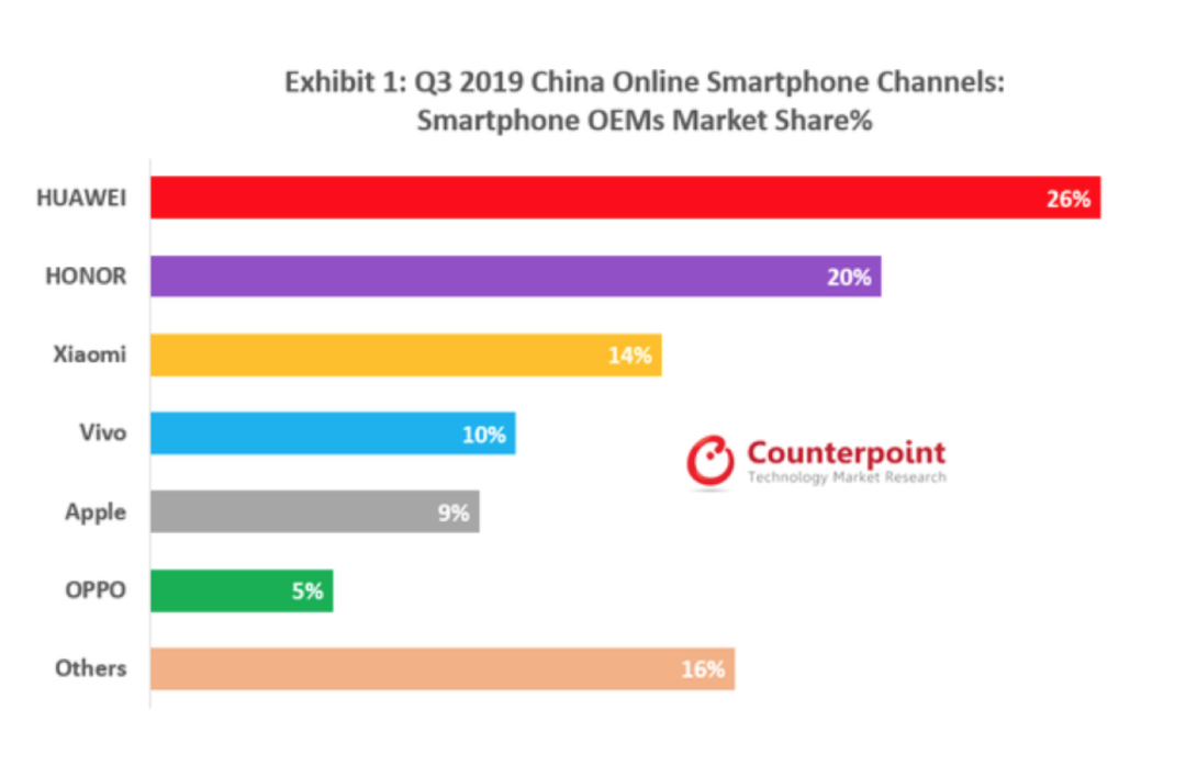 2、從內部環境去看,榮耀品牌站穩中國互聯網手機第一品牌位置,並向全渠道TOP2發起衝擊。在Counterpoint去年三季度的的數據中,榮耀對身後幾大品牌有着較大的領先優勢。榮耀自身的市場份額、技術積澱以及企業發展等都到了需要對品牌革新的階段。