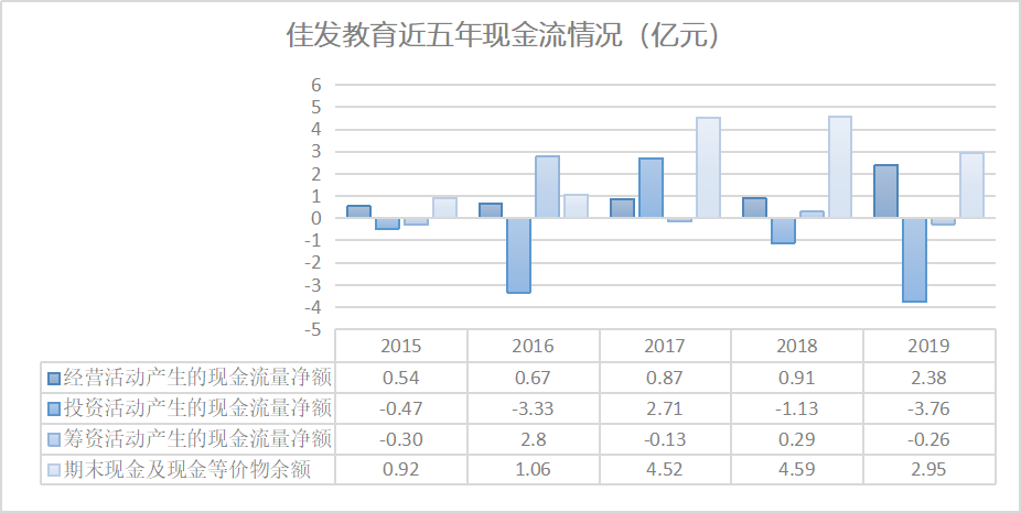 2019年佳發教育經營活動產生的現金流淨額為2.38億元,同比增長160.63%;投資活動現金流淨流出3.76億元,同比增長231.8%;籌資活動淨流出現金2564萬元,同比減少188.17%。