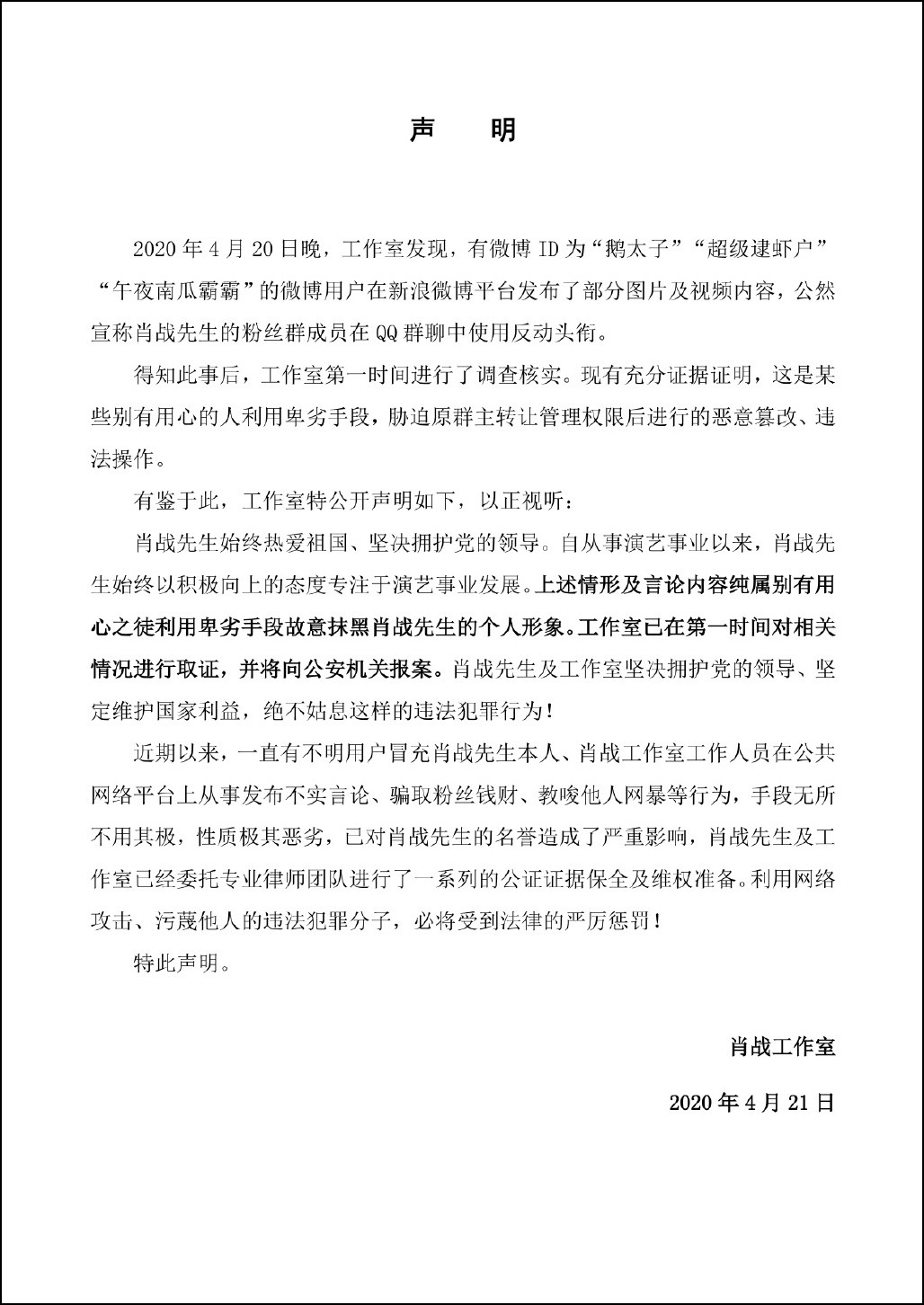針對網友日前反映肖戰粉絲在聊天羣中使用不當圖像作為個人頭像,並公開發表反動言論的問題,肖戰工作室於21日晚7時許發佈聲明進行澄清。