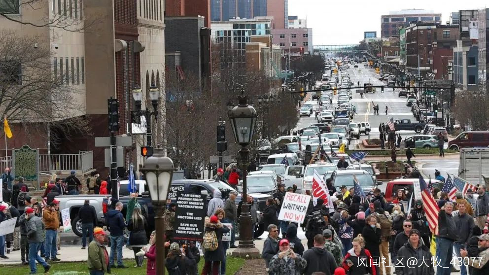 密歇根州的抗議早在上週三(4月15號)就舉行了。抗議聲音很大,據説州議會大廈被成千上萬汽車示威者封鎖,齊按喇叭鳴笛示威,人羣揮舞橫幅支持川普,抗議民主黨州長格蕾琴·惠特默(Gretchen Whitmer),高呼“把她銬起來”。有人揮舞着美國國旗,高喊“自由,自由,自由”。
