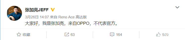 值得注意的是就在今年3月26日,OPPO的核心技術大牛張加亮發表了第一條個人微博。於這背後,或是OPPO有將這個業界都比較推崇的“閃充之父”打造成技術流派網紅高管的意圖。