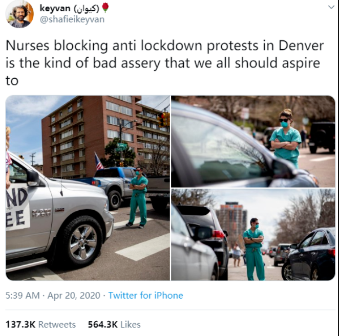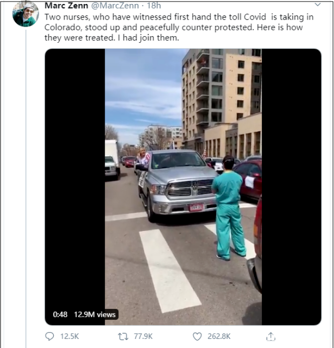 昨天(20日),在美國的社交網絡上,一名白人女子拒絕遵守地方政府的防疫措施反而上街抗議、結果被一羣穿着醫護人員服裝的人攔住的視頻,引起了美國全網的圍觀。