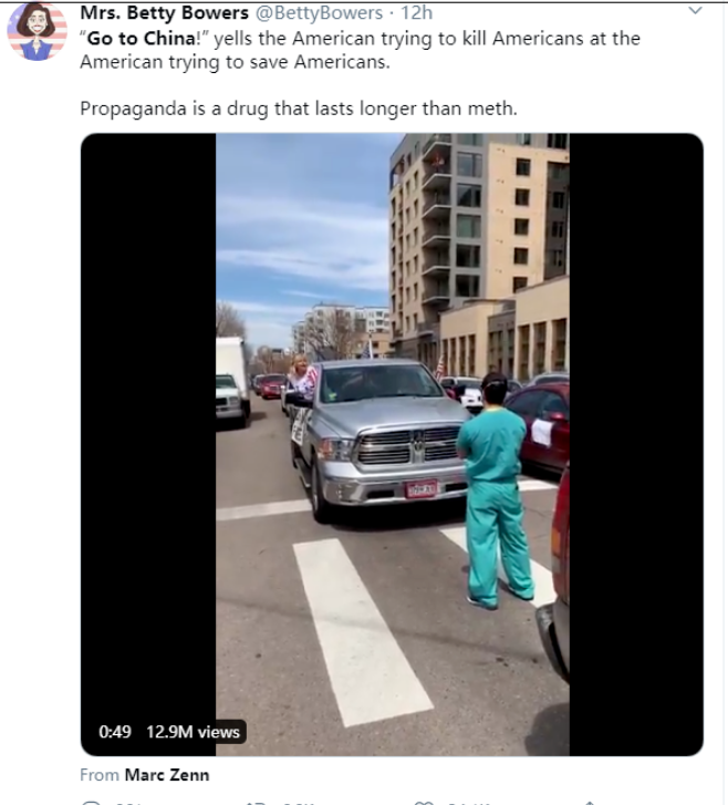 根據美國《華盛頓郵報》的報道,這段白人女子對穿護士服裝的亞裔男子咆哮“這是美國,是自由的土地,你如果想要共產主義,就滾去中國”的視頻,目前已經在美國的社交網絡推特上獲得了1200萬的播放量。