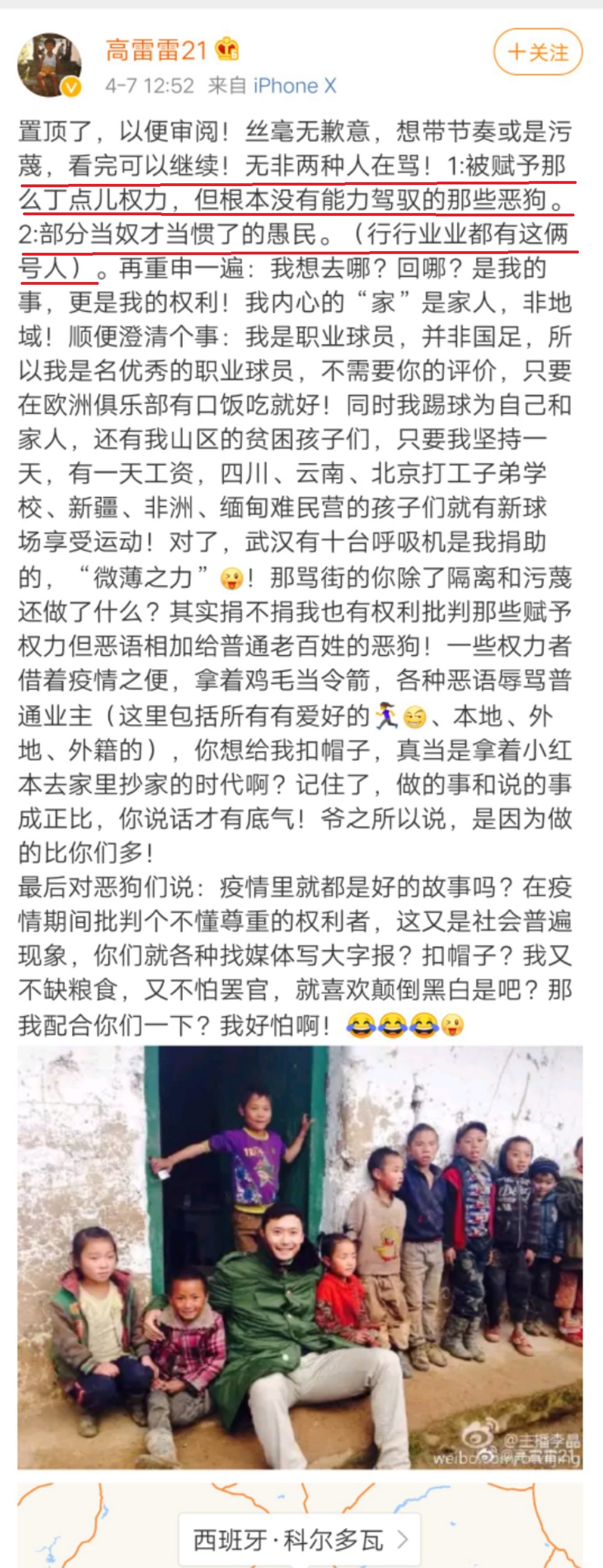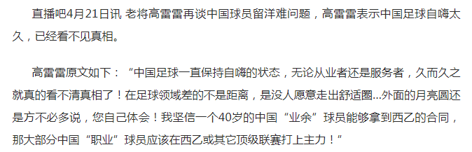 最近的發言動態是4月21日,高雷雷向媒體表示:中國足球一直保持自嗨的狀態,無論從業者還是服務者,久而久之就真的看不清真相了!在足球領域差的不是距離,是沒人願意走出舒適圈…外面的月亮圓還是方不必多説,您自己體會!
