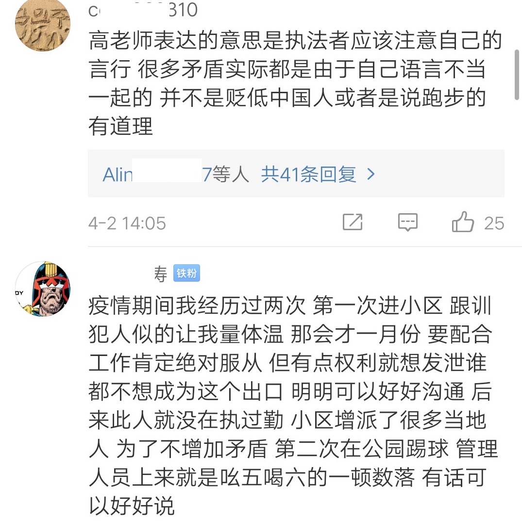 “那些執法者或是臨時賦予權力的人,有幾個會使用尊重的口吻跟你溝通的?誰聽了都會牴觸不是嗎?所有報道都是有傾向性的,沒一個報道體現事發當時管理者的態度是什麼樣?”
