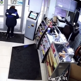 還有這位想要搶劫的漢子,為了嚇唬店員,拿起辣椒水就衝自己噴個不停。