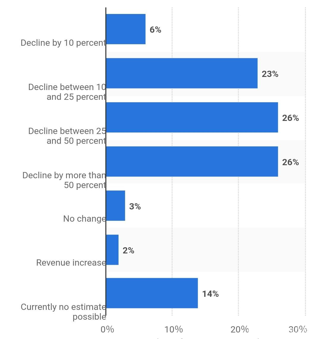 結果顯示,有26%的公司預計,2020年收入要減少50%以上,僅有2%的公司認為收入會上升。