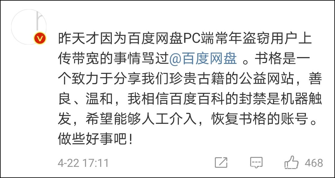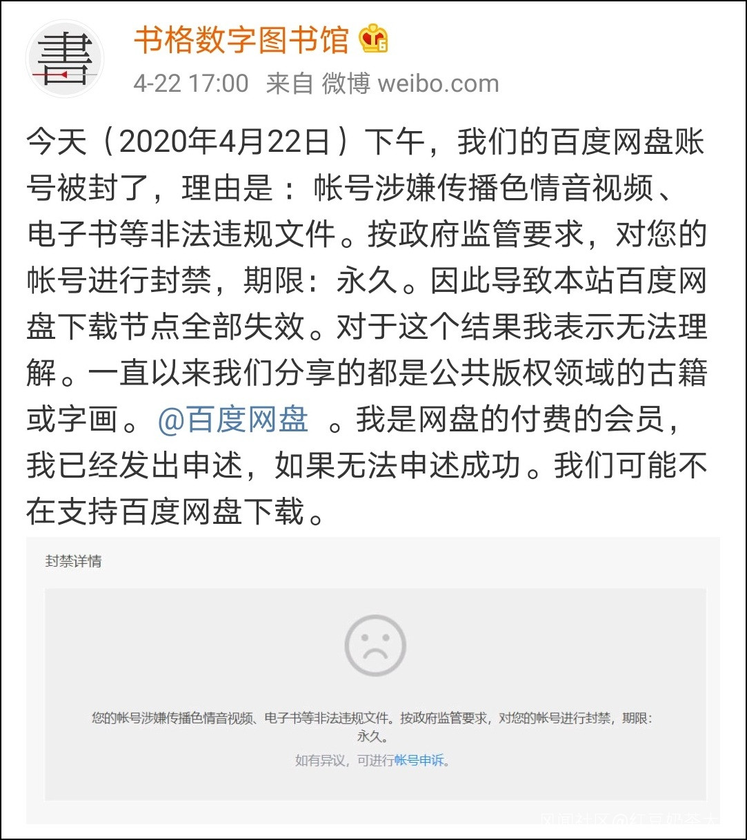 知名珍貴古籍資源分享平台“書格圖書館”百度網盤賬號被封 理由是涉嫌傳播色情文件_風聞