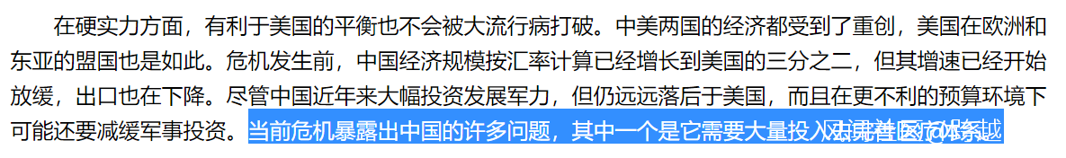 **約瑟夫·奈認為在這次疫情後,中國急需完善醫療體系。**我真不明白他為何有這種預測,也許西方新聞看多了,分不清東南西北了嗎?中國抗疫速度比西方快了幾十倍,難道要中國今後醫療體系要比西方好上上萬倍嗎??即使中國要完善醫療體系,也一定是跟中國過去比,絕不會跟美國的醫療體系比,西方的醫療體系只是自我感覺良好罷了。中國疫情後近日發佈的要重點建設的基建項目有三:一是要重點建設5G網絡及配套的項目;二是國家重大建設項目;三是大力支持與創新科技有關的基建。約瑟夫·奈你是喜歡道聽途説呢?還是看到了也不願意相信呢?就武斷地判斷中國要急需完善醫療體系建設,真是可笑!