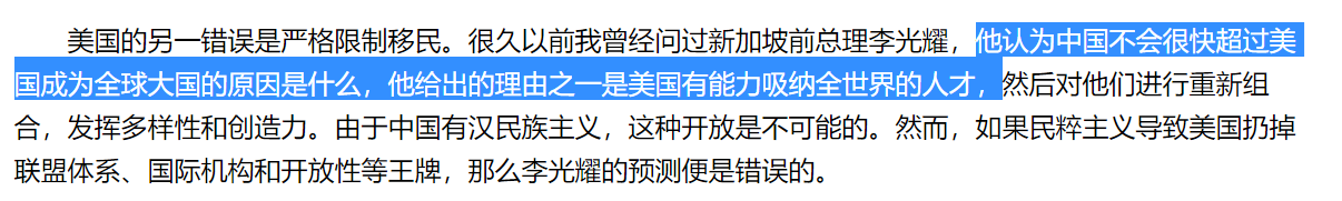 人才跟着能創造的財富走,而教育服務人才,兩者相互作用,約瑟夫·奈一開始就以意識形態來判斷結局,註定要成為歷史的笑柄。