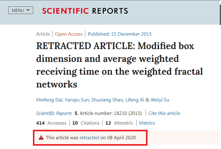4月8日,《自然》旗下的《科學報告》(Scientific Reports)雜誌在網站刊發聲明,宣佈撤回江蘇大學理學院教授戴美鳳等人於2015年12月15日在線發表的一篇論文,指其抄襲。
