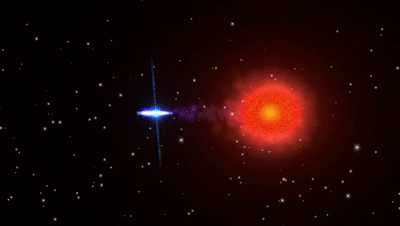 圖1: 中間是脈衝星,圍繞脈衝星運動的是它的伴星,一個小質量恆星。,可以看到恆星物質受脈衝星影響正在脱離,隨後被脈衝星吸積或者向宇宙空間佈散。圖片來源:NASA。https://svs.gsfc.nasa.gov/11215