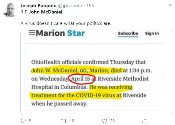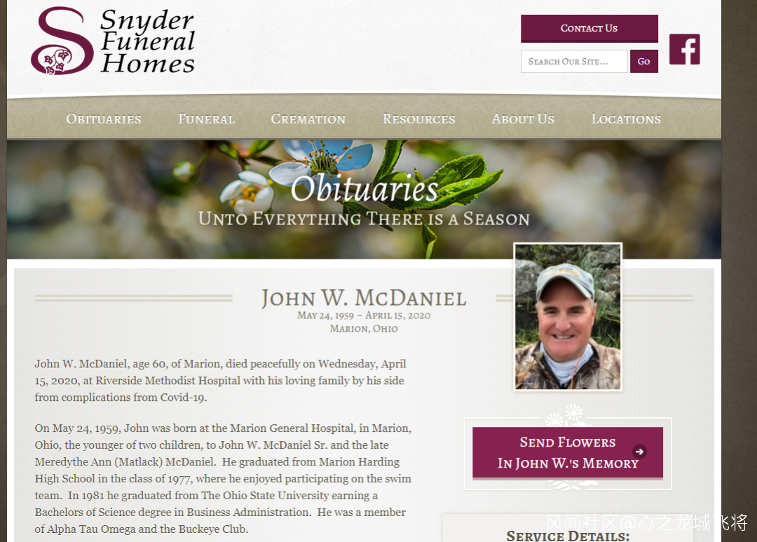 這名白人男子名叫John W. McDaniel,來自美國的俄亥俄州。在幾天前,他在感染了新冠病毒後,因醫治無效不幸離世,享年60歲。