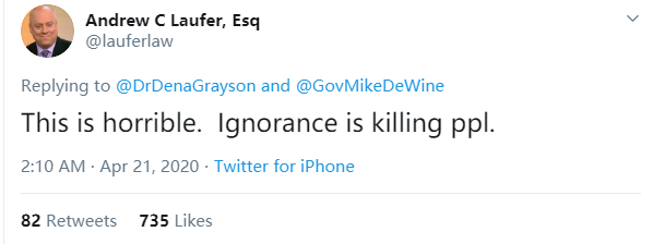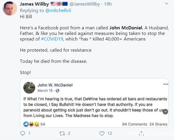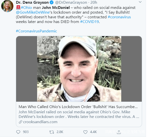 在3月15日的時候,該賬號又發帖攻擊起因疫情惡化而下令關閉酒吧和餐館的俄亥俄州州長Mike DeWine,稱這種限制性的措施是狗屎和瘋狂的,並表示自己不會因為害怕得病就被嚇得不敢出門,政府無權阻止他們過自己想要的生活。