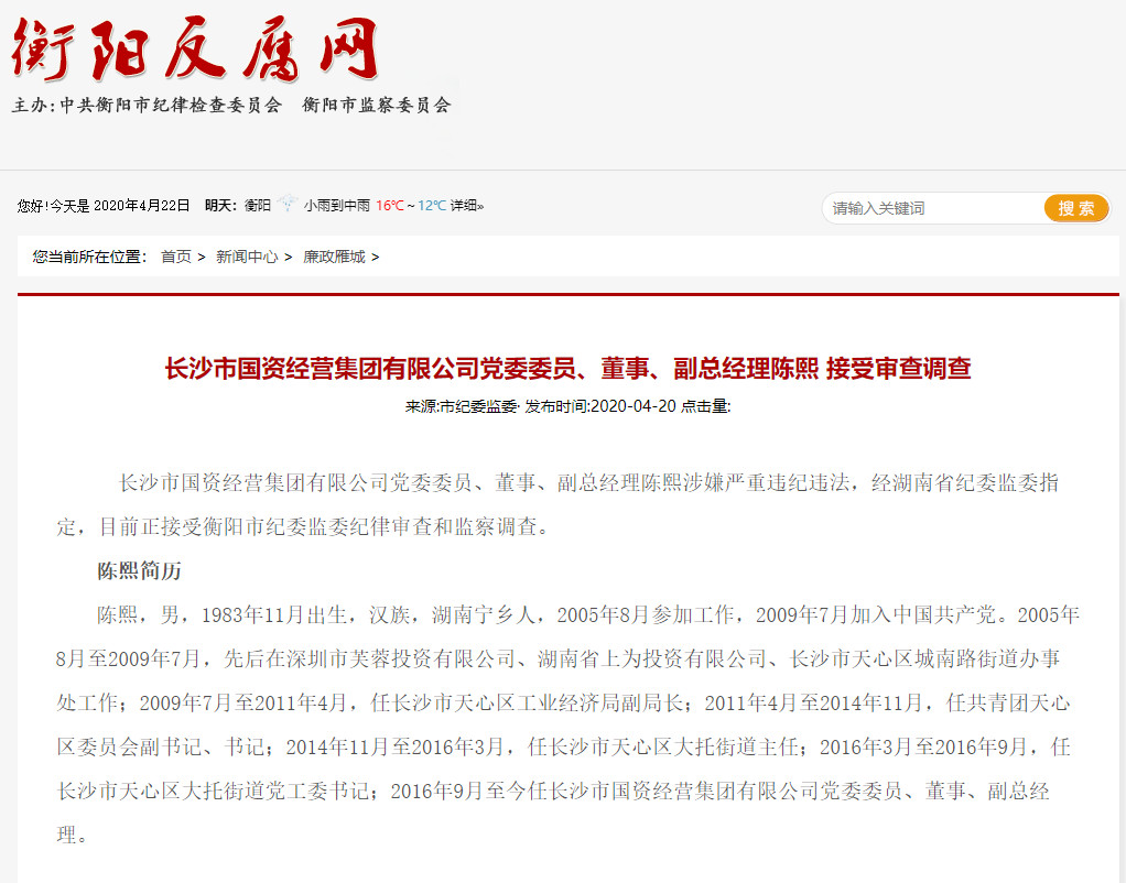 而在同一天,衡陽市紀委監委網站發佈消息,長沙市國資經營集團有限公司黨委委員、董事、副總經理陳熙涉嫌嚴重違紀違法,經湖南省紀委監委指定,目前正接受衡陽市紀委監委紀律審查和監察調查。