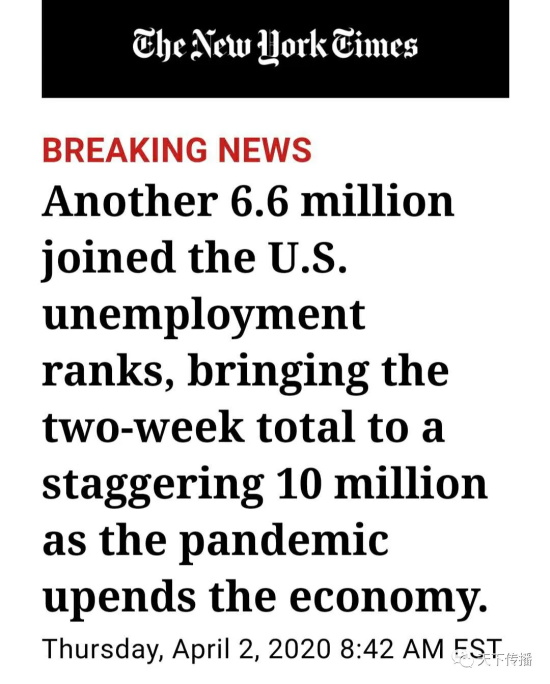 比疫情更可怕的是失業。我昨天的日記提到美國失業300多萬人,是上週的數字。這周又增加了660萬,達到了1千萬。