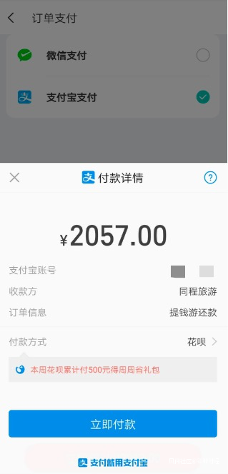 該用户上傳的截圖顯示,其需要支付2057元,收款方為同程旅遊,訂單信息為提錢遊還款,付款方式為花唄。