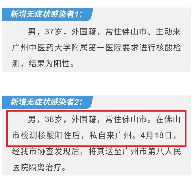 近日,廣州市衞健委發佈的一個新增無症狀感染者病例,引發公眾關注。據通報,一位常住佛山市的外國籍男子,在佛山檢測核酸陽性後,私自來廣州。廣州協查發現後,將其送至廣州市第八人民醫院隔離治療。