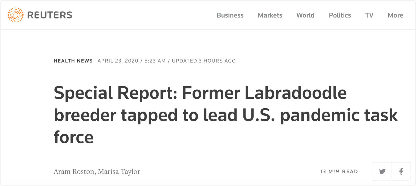 路透社認為,和許多美國官員一樣,從總統特朗普到基層官員,阿扎低估了疫情的嚴重程度。作為衞生與公眾服務部長,阿扎還高估了包括疾控中心、食品和藥品管理局在內的相關部門的疫情應對準備工作。“阿扎樂觀的公開聲明和選擇一位缺乏經驗的助手,是該機構應對危機時問題頻出的標誌。”