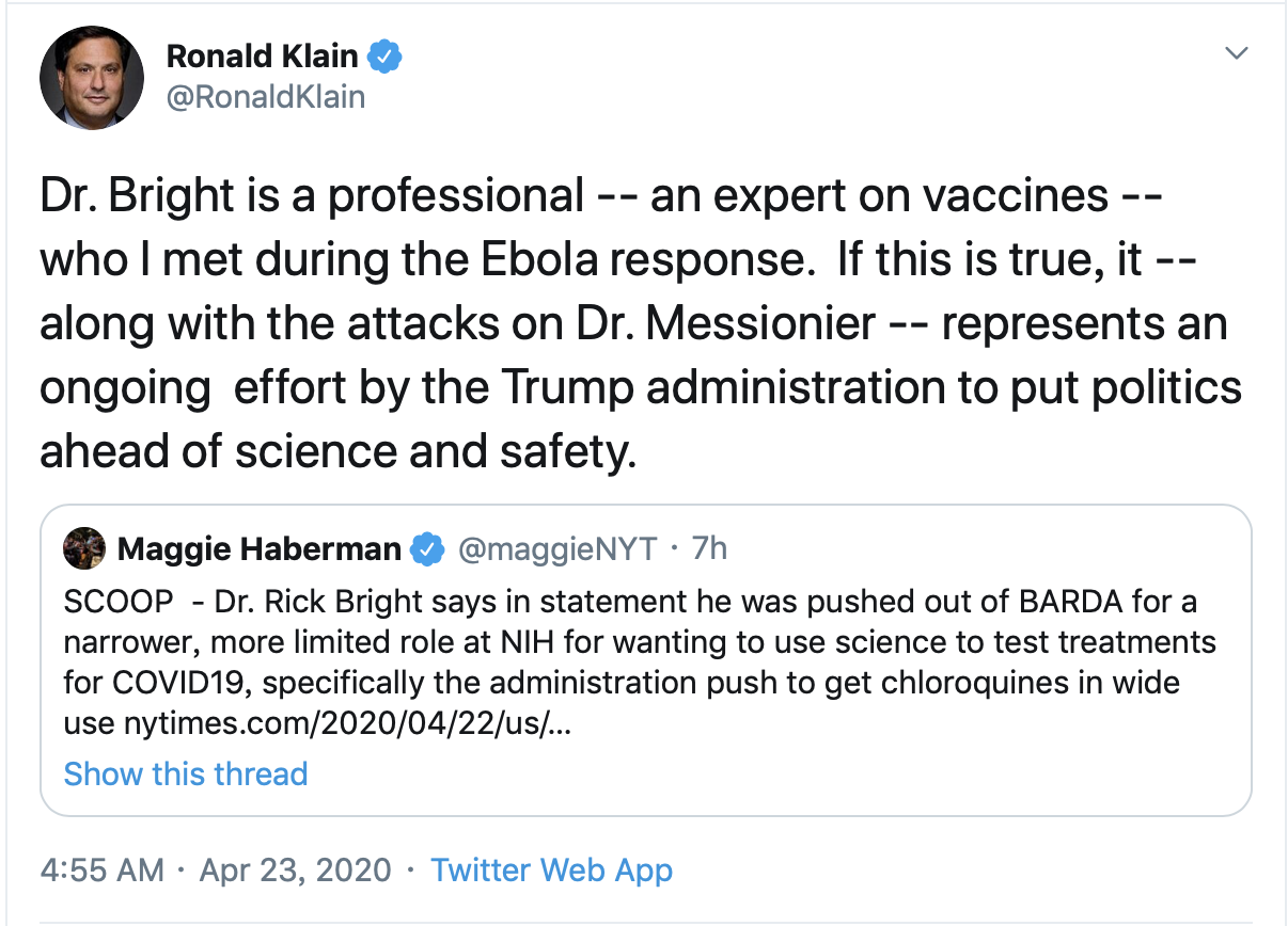 曾領導美國政府2014年埃博拉疫情應對的羅納德·克萊恩在社交媒體上支持布萊特:“布萊特博士是疫苗方面的專家,如果這(布萊特被調職的原因)是真的,説明特朗普政府一直致力於將政治凌駕於科學和安全之上。”