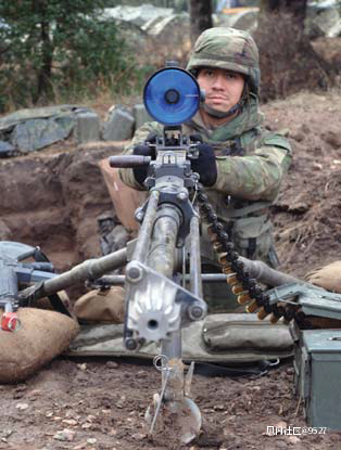 一挺HB M2 .50口徑機槍在野外演習中。AN/TVS-5型機槍上安裝了一個AN/TVS-5型機槍夜視儀,並配有M19空包彈射擊附件。