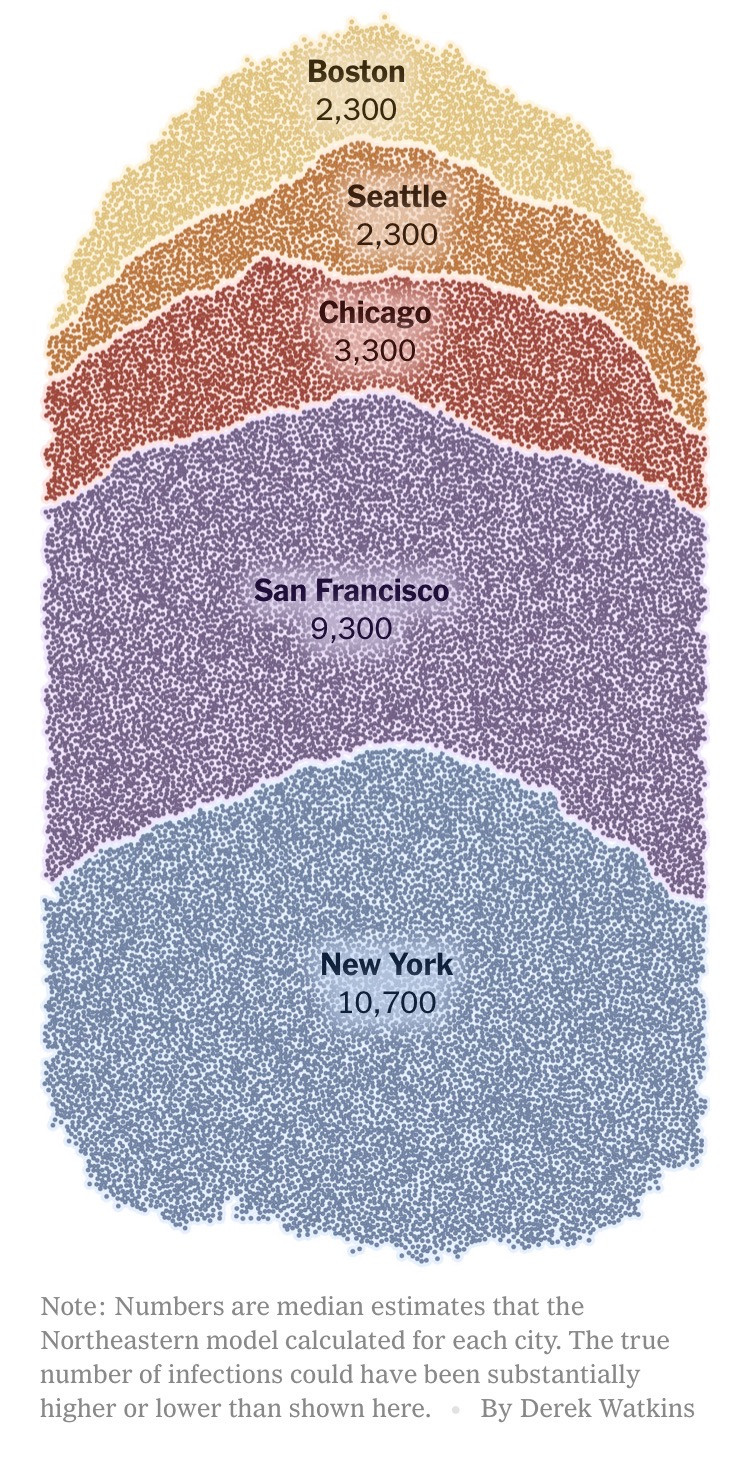 據研究人員估計,在2月中旬,即紐約市學校關閉前一個月,紐約市和舊金山已經有超過600人感染新冠病毒,西雅圖、芝加哥和波士頓已經有100多人感染。到3月1日時,紐約證實了第一例確診病例,當時實際的感染人數可能已經超過1萬。