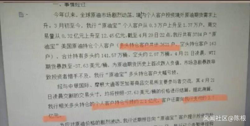 而根據網傳的一張關於中行的事件描述圖:“境內客户投資原油期貨需求上升,3月初至今我行原油寶個人客户從0.3萬上升到1.37萬户,周交易量從0.32億元上升到12.45億。據此測算,我行相關多頭持倉的個人客户持倉虧損2.1億元,客户還需支付3.7億元。”