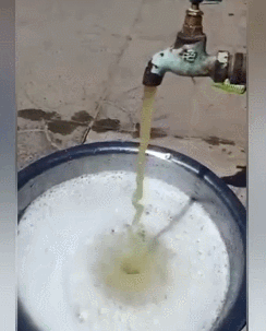 從視頻裏看,村民家從自來水管裏流出來的水有刺鼻味道,水質發黃起泡。