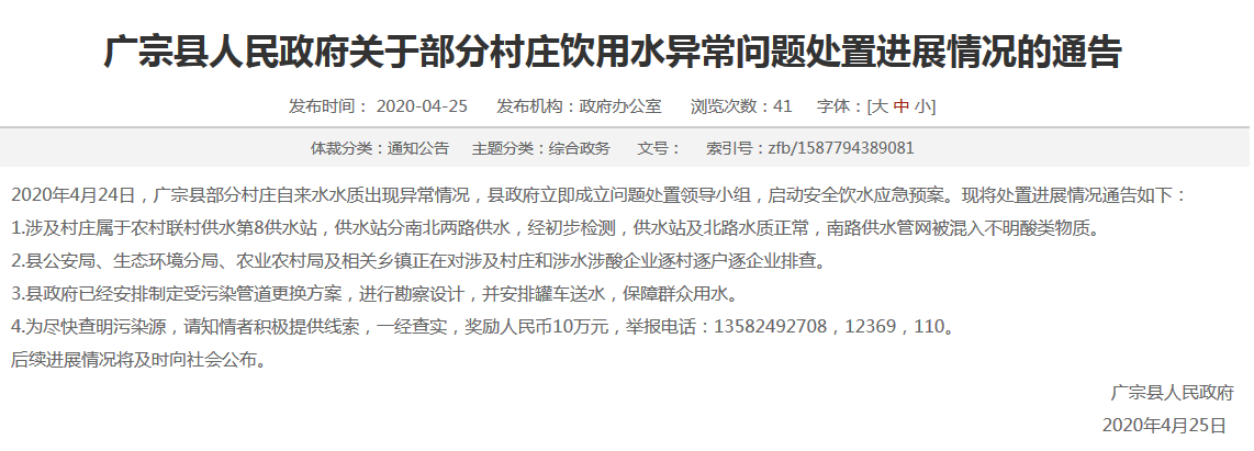 2020年4月24日,廣宗縣部分村莊自來水水質出現異常情況,縣政府立即成立問題處置領導小組,啓動安全飲水應急預案。現將處置進展情況通告如下: