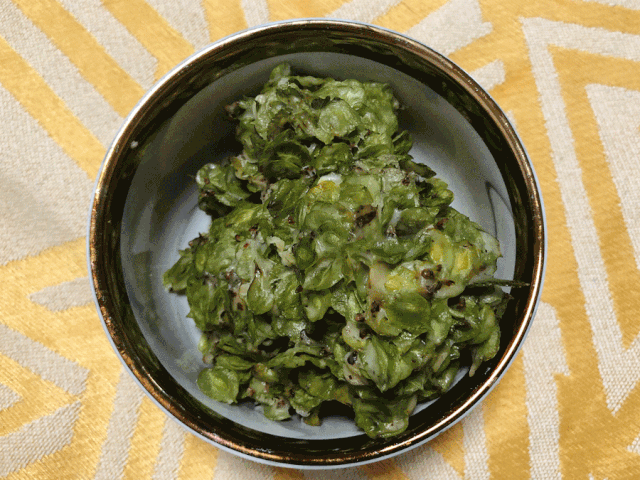 香椿還有個吃法,極考驗手藝——沏香椿。嫩紅的香椿芽放進大碗裏,開水澆下去,合蓋燜一會兒,香椿芽的濃郁香氣便十足的逸散出來。這時轉為嫩綠色的香椿芽,隨便拌一拌就夠好吃了。