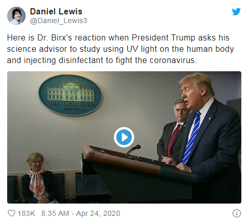有網友吐槽道,當特朗普總統讓他的科學顧問了解下關於給人體照射紫外線光和注射消毒液來抗疫的時候,博克斯博士是這個反應: