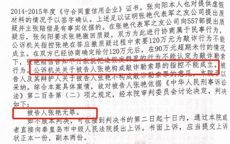 秦皇島海港區法院於2019年3月18日作出的一審判決書顯示,公訴機關對張豔構成敲詐勒索罪的指控不能成立,判被告人張豔無罪。受訪者供圖