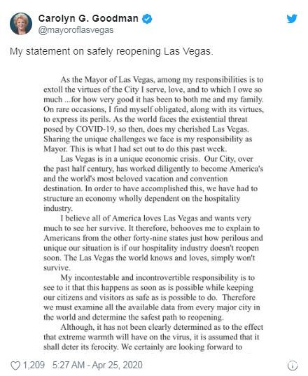 她進一步表示,“拉斯維加斯人明智又勇敢。我們需要首先採取行動…….我們會的。我要求的是,我們全美的兄弟姐妹,卡森城(即內華達州首府)和華盛頓特區的政府,以及我們健康並充滿活力的自由媒體,在我們明智地重新開放美國城市的同時,向我們展示愛和支持。”