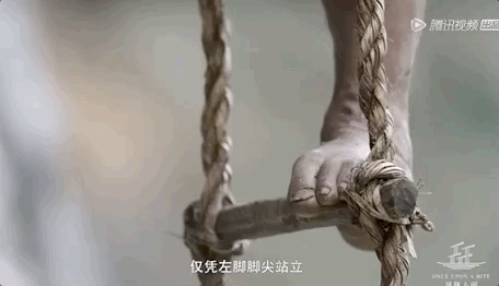 一手握住藤梯,一手握住刀收割,另一隻腳還需要穩住刀具的長杆,全身就剩下幾個腳趾頭作為支撐點。