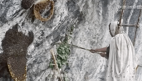 獵蜜人用竹竿插入崖壁縫隙,順杆靠近蜂巢。