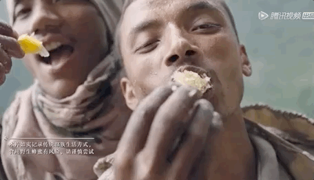 獵蜜人們將新鮮的蜂巢大口塞進嘴裏。